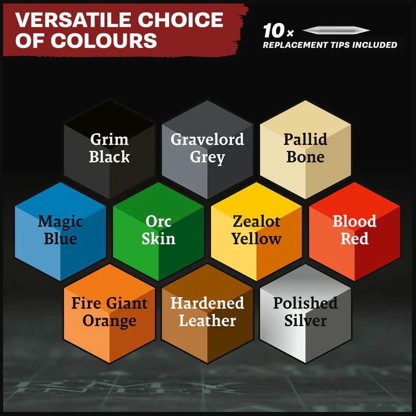 - 9 Speedpaint Markers Colours (Grim Black, Gravelord Grey, Pallid Bone, Magic Blue, Orc Skin, Zealot Yellow, Blood Red, Fire Giant Orange, Hardened Leather)
